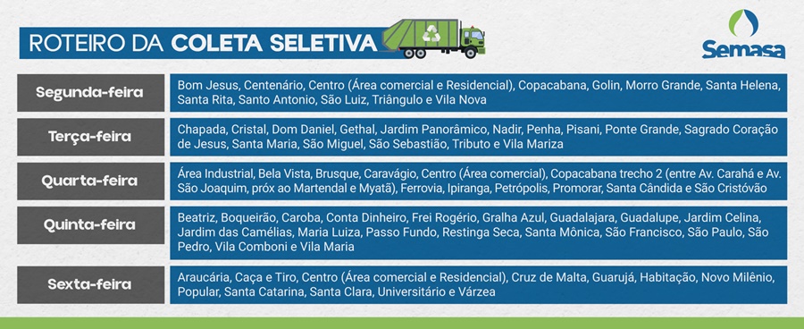 Seguindo o cronograma, os três caminhões coletores passam nesta sexta-feira (14) pelos bairros: Araucária; Caça e Tiro; Centro (área comercial e residencial); Cruz de Malta; Guarujá; Habitação; Novo Milênio; Popular; Santa Catarina; Santa Clara; Universitário; Várzea. O serviço de coleta seletiva de Lages é gerido pelo Consórcio Intermunicipal Serra Catarinense (Cisama), com o apoio da Secretaria Municipal de Águas e Saneamento (Semasa).