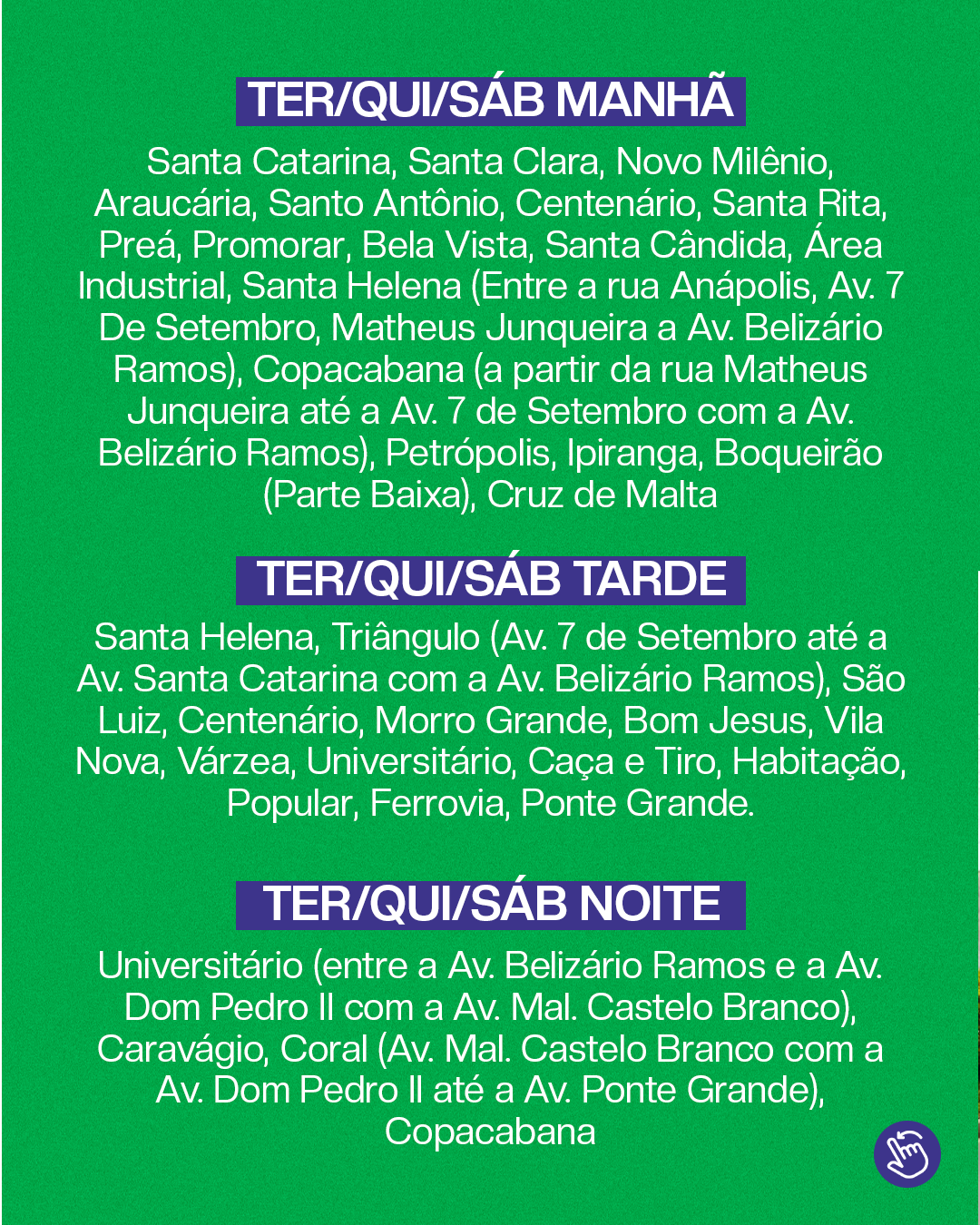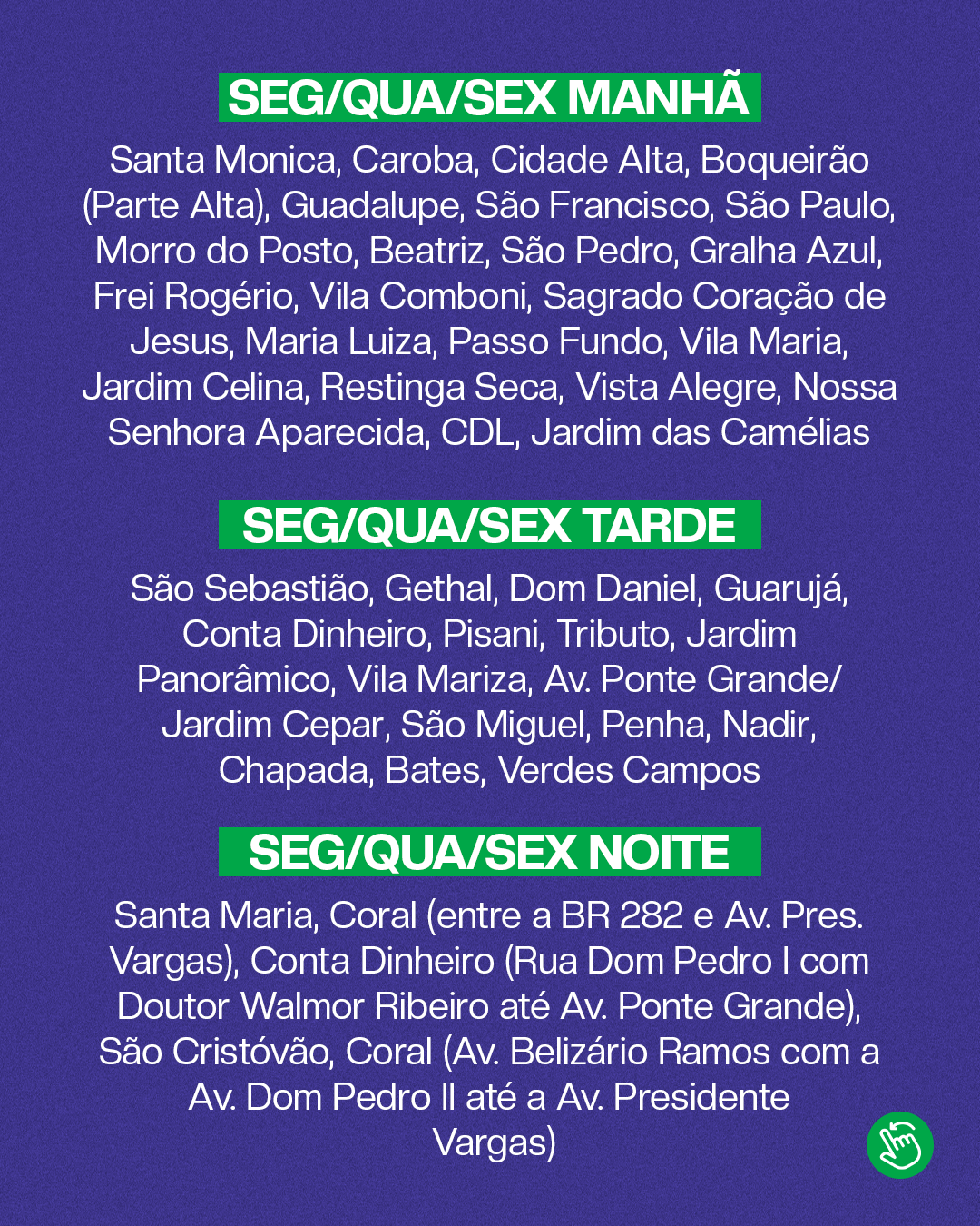 De acordo com a tabela do novo cronograma, entre os locais com coleta no período da manhã nas segundas, quartas e sextas estão bairros como Santa Mônica, Caroba, Cidade Alta, São Francisco, São Paulo, Maria Luíza e Sagrado Coração de Jesus. No turno da tarde, o atendimento contempla bairros como São Sebastião, Guarujá, Tributo, Bates, Vila Mariza e Penha. Já no período noturno, passam a ser atendidas localidades como Santa Maria, Coral e trechos do bairro Copacabana.