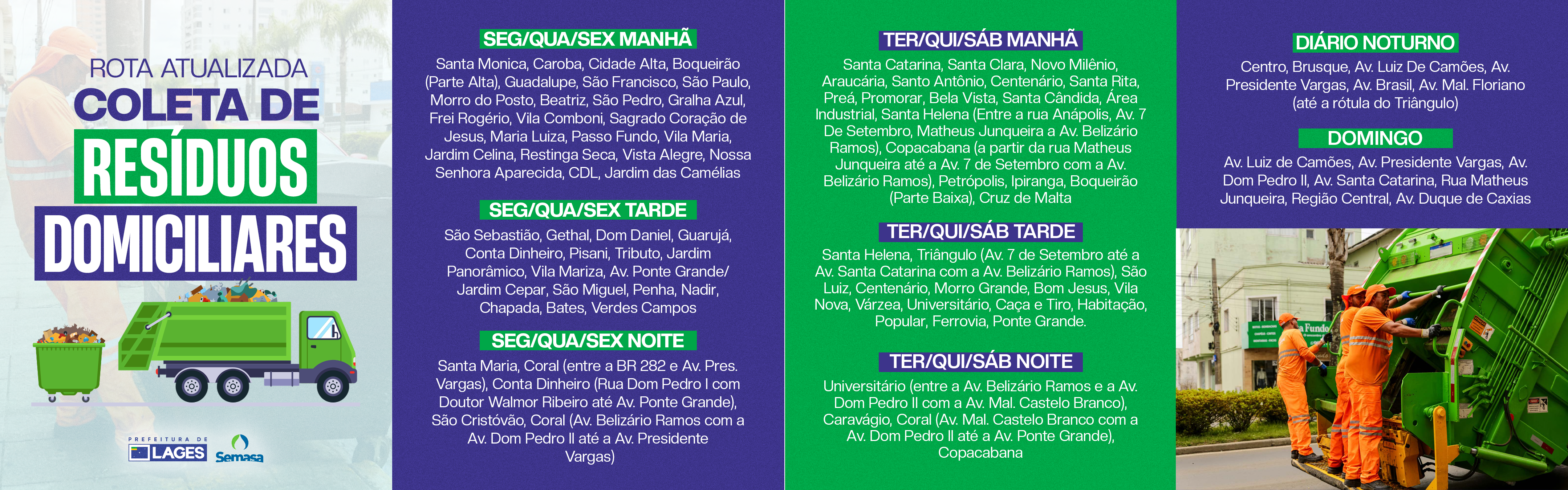 A partir de segunda-feira (2 de março), moradores de alguns bairros de Lages devem ficar atentos aos novos horários da coleta de resíduos domiciliares. A alteração envolve apenas o período em que o caminhão passa pelos locais, ou seja, manhã, tarde e noite, sem qualquer mudança nos dias já definidos no cronograma semanal.